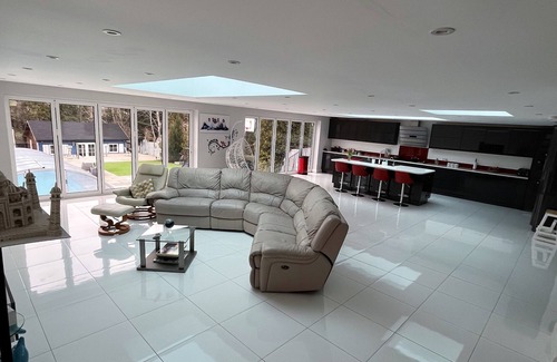 Air-con family room: 8 seat reclining sofa with 55" TV with Sky, Netflix, Prime & Wii game.