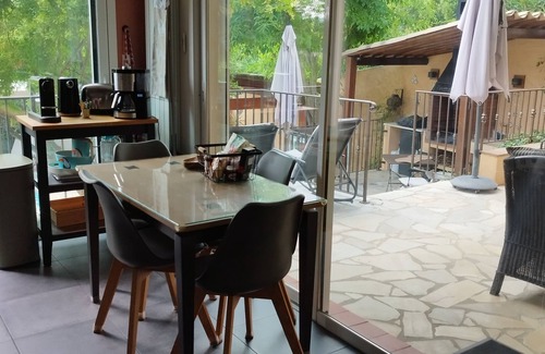 Air-conditioned villa of 120 m2 with 10 x 4 swimming pool (alarm) on a 1350 m2 plot, private parking inside, beautiful garden, pergola facing the swimming pool with garden furniture, 3 large terraces, spacious fully equipped kitchen, bathroom dining room with access to a large terrace,