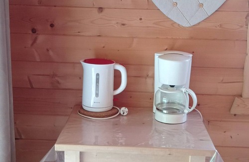 Wooden chalet with Queen size bed, kitchenette and bathroom, terrace and garden.