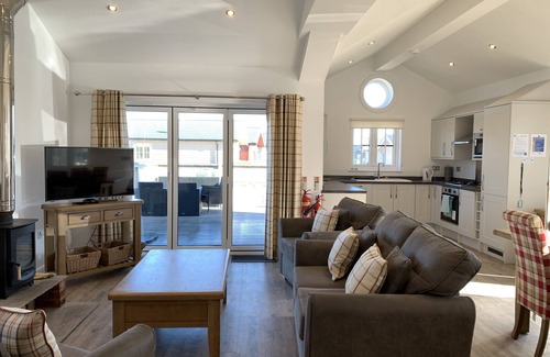 Enter through the side door into the spacious open plan living area. To the right is the large kitchen with all the appliances you need. To the left is the dining space. And in front, is the living room with 2 sofas, an arm chair, coffee table, log burner and TV/DVD.