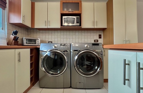 The master bedroom has a dreamy queen-size bed, a Smart TV, an attached full bathroom & closet space. The second bedroom has a comfy full-size bed, workspace and closet. The third bedroom also has a full-size bed, workspace and closet. All bedrooms have AC.