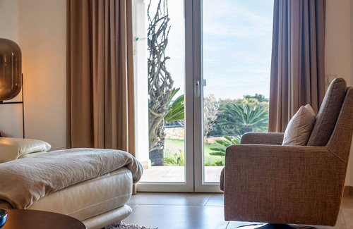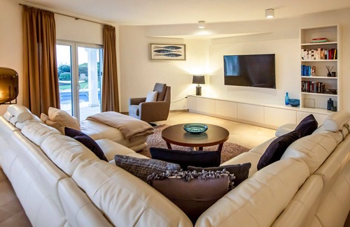 The open plan living and dining area of this luxurious Algarve villa is the perfect space for relaxation and entertainment. The interior is designed to maximize comfort and elegance, with ample seating and high-end finishes throughout. The fully-fitted kitchen features Miele appliances and has everything you need to prepare meals and entertain guests.