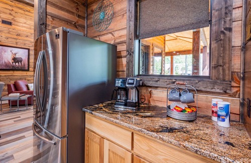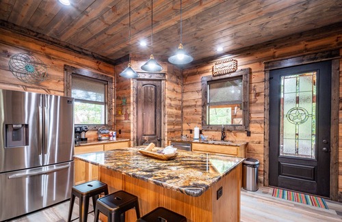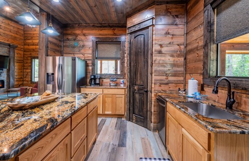 Trains I Missed is conveniently located near Beavers Bend State Park, Broken Bow Lake and Hochatown area attractions, restaurants and shopping. As you enter the warm, fully furnished rustic cabin you'll be surrounded by nature in a great room that boasts vaulted ceilings and large windows for breathtaking views. This area features upscale décor including a dining table with seating for 6, island with seating for 3, and an America Leather sofa and recliner featuring the most comfortable Queen Plus memory foam sleeper. The full kitchen includes all the appliances and cookware to make your favorite meals!