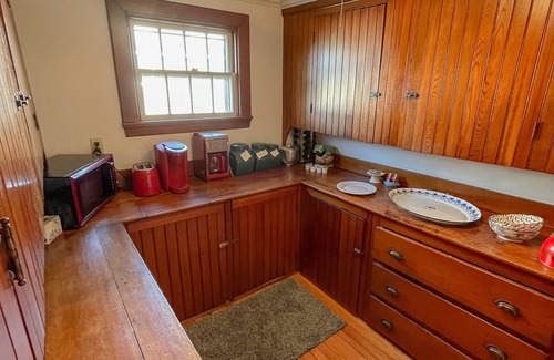 The kitchen is fully-equipped (lots of storage and prep room, thanks to the adorable butler's pantry) with all modern appliances, cookware, dishes, etc. The kitchen also has a breakfast table that can seat 4–6. The dining room seats 6 and overlooks the lawn and waterfront — these two rooms are close enough to comfortably seat a larger party without feeling disconnected.