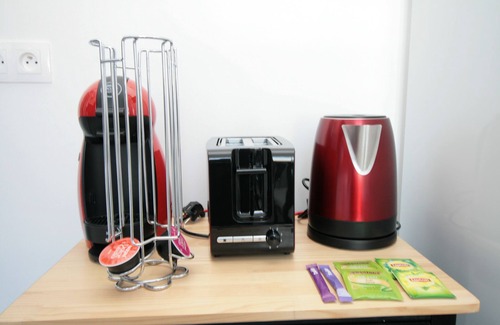 → Coffee machine, toaster, kettle, coffee pods, tea bags and my favorite sweets are present to feel like at home