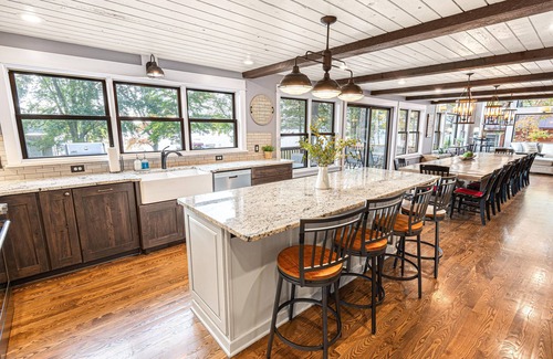 Our cabin is extremely spacious with over 5,500 square feet in 4 levels, complete with 7 bedrooms, 5 bathrooms, living room, family room, entertainment room, huge kitchen, and much more! The large living room has vaulted ceilings and multiple seating areas where you can curl up on the couch for late night movies on the 60” smart TV. The lower family room area is great for the kids to hang out and play or watch their own movies on a 75" TV! Or enjoy a game of pool, ping pong, Foosball or shuffleboard as well as 3 different arcades featuring over 400 games - all in the lower level! And the entire family can enjoy meals together in the fully equipped kitchen and huge, 15' custom dining table that seats your entire group!
