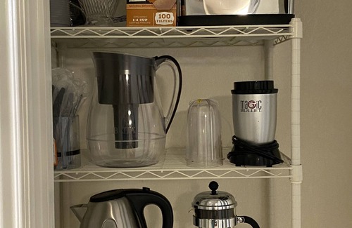 The fully equipped kitchen has pots, pans, bakeware, drip coffee maker, a French press coffee maker, electric tea kettle, large microwave/convection oven, toaster, two induction cooktops, a garbage disposal, a Bosch dishwasher, granite counters, full sized refrigerator, plates/cups/glasses, cutlery, placemats/napkins, Brita water filter, and complimentary coffee, tea, hot chocolate, half and half, etc.