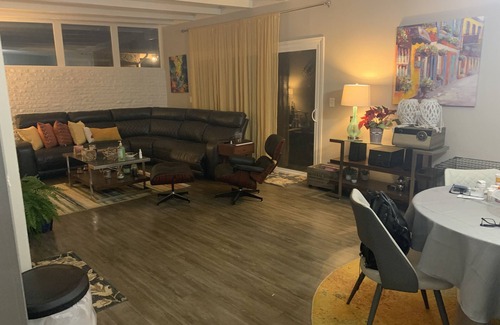 Renovated mid century modern 3 bed 2 bath. Fully furnished including One double and one queen. Washer/dryer, covered parking. Back yard with covered patio and grill. Fully equipped kitchen. Entire house available for short term rental April 1 to May 16. Possible longer, flexible rental of one bedroom with bath for traveling professional(s). Owner present after May 16, 2020. Includes utilities, linens, towels, etc. Other items may be available upon request.