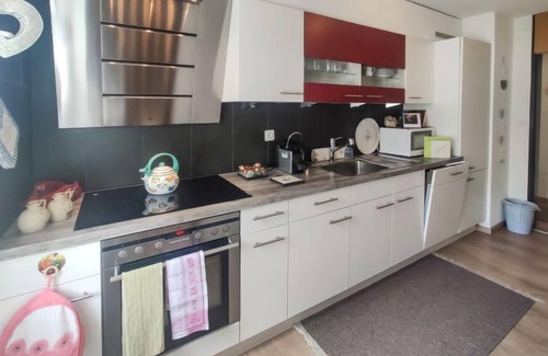 "Allod Park Haus C 207", 3-room apartment on 2nd floor, north-west facing position. Spacious and bright, renovated, modern and tasteful furnishings: living/dining room with cable TV and flat screen. Exit to the balcony, west facing position. Large, 1 double bedroom with 1 french bed (2 x 90 cm, length 200 cm), cable TV and flat screen. 1 children's room with 1 sofabed (90 cm, length 200 cm), 1 double bed (2 x 90 cm, length 200 cm), cable TV and flat screen. Large kitchen (oven, dishwasher, 4 ceramic glass hob hotplates, kettle, microwave, electric coffee machine, Capsules for coffee machine (Nespresso) extra, fondue Set (cheese)). Shower/WC, double hand-basin. Wooden floors. Balcony furniture. Side view of the mountains and the city. Facilities: Internet (WiFi, free). Parking (extra) at the house. Please note: apartment street side. Non-smokers only.