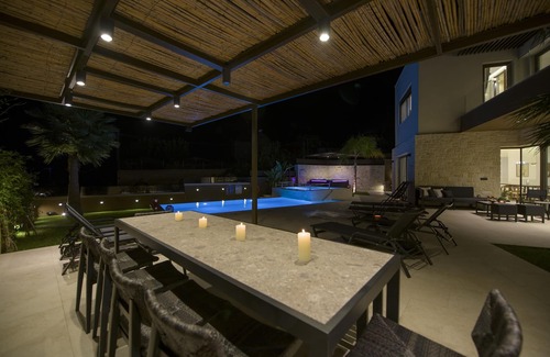 The space consists of four bedrooms and six bathrooms, living room, dining room, home cinema area and billiards. The outdoor area has a swimming pool, children pool, bbq facilities and jacuzzi!