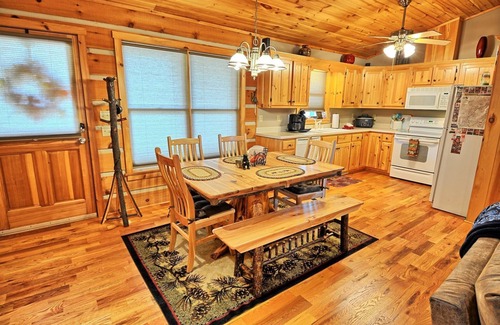 Main Level: As you enter our cabin, you will find the great room with plenty of seating, stone gas fireplace (seasonal) which is wonderful to snuggle up to on those cold mountain winter days, fully stocked kitchen with a regular 12 cup coffee maker AND Keurig maker, microwave, crock pot, blender and more, and the dining room. The 2 master bedrooms with queen beds have their own En Suite private bathrooms. Great for 2 couples!