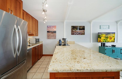 The interior includes a fully equipped kitchen, open living area with ocean views, a cozy queen bedroom, and a full bathroom with a tub/shower combo. Whether you’re preparing island-inspired meals, unwinding with a good book, or enjoying an evening cocktail on the lanai, the condo offers everything needed for a relaxing stay.