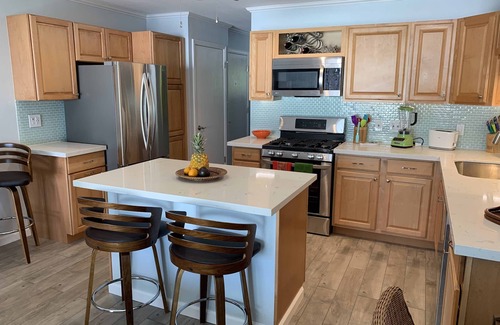 Inside you’ll find all the comforts of home (and then some). Included is a fully appointed living room with two modern recliners, a 43” 4K HD TV (with cable/internet, blu-ray dvd player, and an additional HDMI/USB connections for other devices), plenty of comfortable seating, and a sweet little secretary desk. There’s a fully-equipped modern kitchen complete with current appliances and cookware, blender and coffee maker (even a separate USB charging station!). The bathroom offers a soothing rain shower head in the private bath apart from a separate vanity area. In the bedroom is a king size Leesa Legend hybrid memory-foam bed, a large closet and plenty of dresser storage. Blackout curtains on the windows afford full privacy; louvered windows allow in the refreshing trade winds (and a gorgeous view of the mountains above).