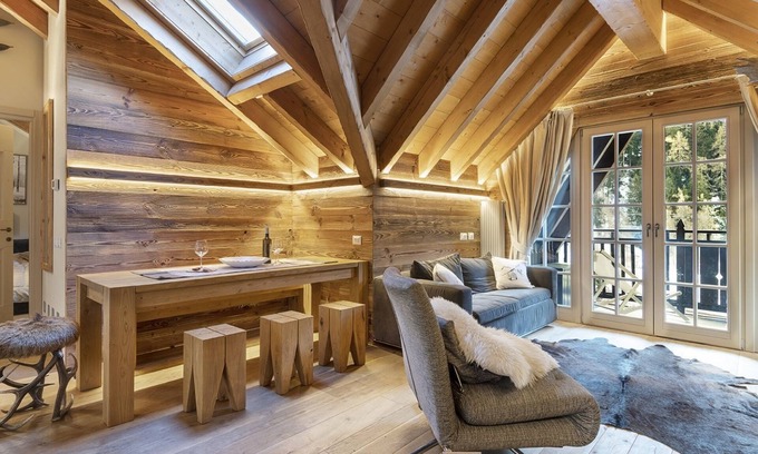The apartment features a spacious living area with a fireplace, Smart TV, and a sofa bed that can accommodate two guests. The touch of class? An iconic chaise longue inviting you to enjoy the view while sipping hot chocolate in the winter months, as you watch the cable cars glide along the ski slopes. In summer, you can have breakfast on the charming terrace, surrounded by nature and caressed by the breeze among the fir trees.