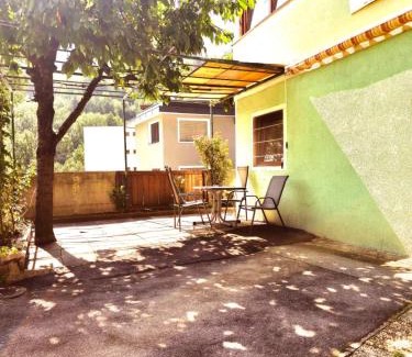 Food & DrinkTea/Coffee makerKitchenDishwasher, Coffee machine, Oven, Stovetop, Dining table, Cleaning products, Refrigerator, Electric kettle, Wine glasses, KitchenLiving AreaSofa, Sitting areaBathroomToilet, Slippers, Towels, Bathtub or shower, Toilet paper, Private bathroomGeneralHardwood or parquet floors, Private entrance, HeatingMedia & TechnologyMobile hotspot device, Satellite channels, Flat-screen TVViewView, Mountain viewBedroomWardrobe or closet, LinensOutdoorsOutdoor dining area, Outdoor furniture, TerraceAccessibilityEntire unit located on ground floor, Entire unit wheelchair accessibleBuilding CharacteristicsPrivate apartment in buildingRoom AmenitiesSocket near the bed |