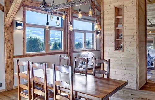 The ground floor has a spacious open-plan feel, with both the living area and kitchen benefitting from exceptional views across the valley to the mountains beyond. There are comfy sofas around the antique wood-burning fire - a lovely environment in which to relax after a hard day’s skiing and enjoy a vin chaud or a hot chocolate. In the kitchen-dining area there is a farmhouse dining table that can easily seat all the guests, and a modern, bespoke kitchen which incorporates original wood detailing. The main lighting in these areas have been handmade by a local artisan and are totally unique, whilst keeping the feel of the farmhouse.