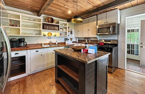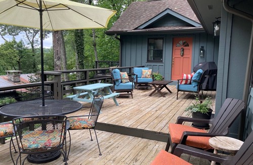 At the front of the house, a blend of charm and playfulness awaits. From the warmth of the firepit to the inviting grill and even a whimsical treehouse nestled on the hill, there's something here for everyone to enjoy. A welcoming, uncovered porch leads you to the home, offering plenty of comfortable seating and easy access to the kitchen—an ideal setup for relaxed gatherings and effortless entertaining. Step through the living room and out onto the deck, where mornings are made for sipping coffee and soaking in the quiet beauty of your surroundings.
