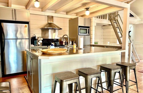 Step into this warm and welcoming retreat, where comfort meets convenience. The main level features an open-concept living space with stylish furnishings, a cozy atmosphere, and a spacious wraparound second-floor deck off the living room. The deck is the perfect spot to unwind, featuring a patio table with chairs for dining al fresco and a comfortable sectional seating area for relaxing outdoors. For extra fun, a loft area above the kitchen, accessible by ladder, offers a great space for kids to watch movies or hook up their game system for hours of entertainment. On the lower level, near the bedrooms, an additional sectional sofa provides plenty of seating so everyone can have their own space to unwind.