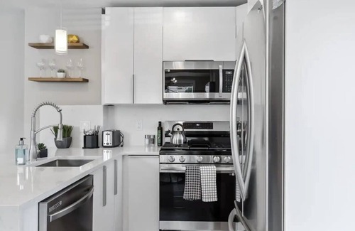 Step inside and be greeted by the stylish and modern interior, thoughtfully furnished with your comfort in mind. The allergy-friendly wood floors throughout all three levels provide a clean and welcoming atmosphere. With a fully equipped kitchen featuring gas cooking, you'll have everything you need to prepare your favorite meals.