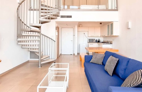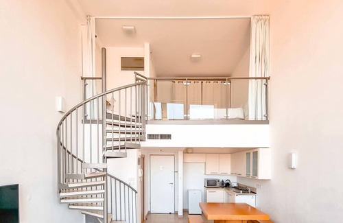 Modern apartment, loft-style designed but perfect for hosting your next family visit or enjoying with friends. There is one bedroom upstairs that is open in the living room but closed by a very large curtain. There is one bathroom upstairs with a toilet. Downstairs there is one sofa bed and one toilet, an open kitchen with living rooms and a terrasse with a spectacular view of the sea and Tel Aviv! You can enjoy a cup of coffee or an aperitif from the comfort of your balcony while watching the sunset. You will be staying in Neve Tzedek, Tel Aviv’s most chic neighborhood, but only a 10-minute walk away from the beach!