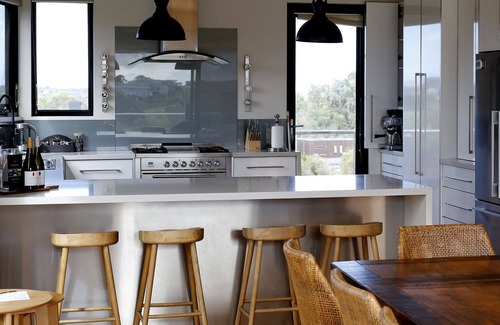 Zone 1 - Modern, spacious, open plan kitchen and dining. Stunning modern kitchen fully equipped with top-of-the-range appliances. Expansive bench with 4 bar stools. Dining table for 8/10 guests, smart television, Sonos Sound System complemented with stylish furnishing, sideboard, and indoor plants opening up onto an expansive northern deck overlooking the golf course.