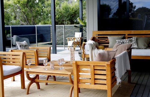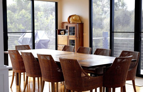 Zone 3 - The Sitting Room is majestic yet cosy. Furnished with 2 x leather couches, telescope, a scale replica of the "America" showcased on a sideboard, and other memorabilia. Perfect place to relax and savour the spectacular view or enjoy a glass of wine in front of the fire. All living zones open onto the expansive back deck making this property an entertainer's paradise. Complete with 4 burner BBQ, outdoor dining table setting, and million-dollar views over the golf course and Cape Schank. '
