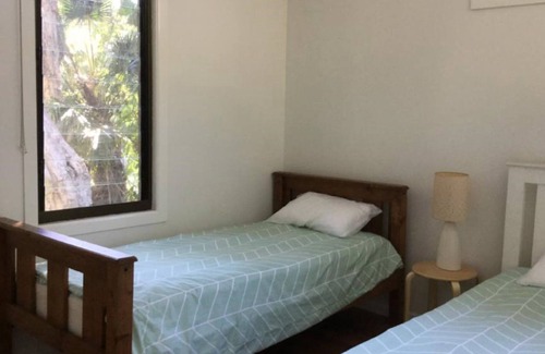 The main bedroom has a queen bed and a deck overlooking the garden area. The second bedroom also has a queen bed and a deck. The third bedroom has 2 x single beds.