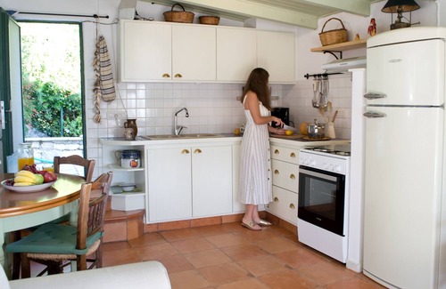 It is rare to find a small private house for 2 people in a perfectly peaceful position enclosed by 5000m2 of private land and garden, within short walking distance of the busy and cosmopolitan Fiskardo and at only 50 meters from the nearest swimming spot. The house is compact (48m2) and consists of one large bedroom, a bathroom, a living room and a well equipped kitchen. There are two large terraces with amazing views and the shore is so close that you can hear the music of the sea.
