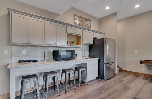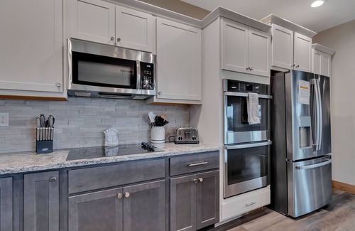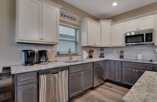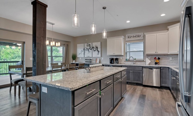 Stunning lake views and three large decks await you in this gorgeous vacation home. Located in the brand-new Branson resort, Chateau Cove, you’ll be a short distance from Table Rock Lake as well as the heart of Branson. Our home features 10 private bedrooms with 10 bathrooms, meaning you’ll have plenty of space and privacy for everyone, even in a full house! The kids will love sleeping in the built-in bunk beds and parents will appreciate the baby and kid gear available for use. There are 6 king size beds, 4 queen beds, and 13 bunk beds located in 2 separate bunk rooms. Occupancy is set at 26 with 33 sleeping options, Take in a sunrise or sunset over the lake from one of the 3 covered decks, enjoy some friendly competition in our downstairs game room, whip up a big family meal in our fully-equipped kitchen, sip drinks in the private hot tub or around the fire pit table, and take a peaceful stroll down the path to the lake. The community indoor pool, outdoor pool, and playground are a short walk away and perfect for a change of pace.