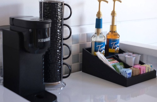 The kitchen is well-equipped with essentials to make cooking easy, including a French press, Keurig coffee machine, toaster, electric kettle, pots and pans, strainer, and a full set of utensils.