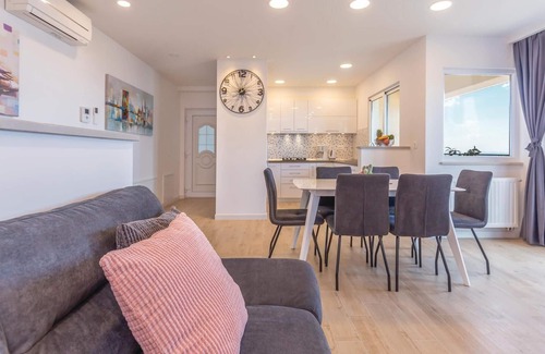On a hill in the town of Makarska is located this well-equipped and stylishly furnished apartment. It has three bedrooms, two bathrooms and a spacious living room with kitchen, from where you have access to the balcony, which offers a beautiful view of the sea. Discover the center of Makarska and its hustle and bustle with various gastronomic and cultural offers. Experience pure swimming fun on the long pebble beaches you will find there. Go on excursions and get to know Dalmatia's culture. Enjoy the relaxed ambience and experience a relaxing vacation.