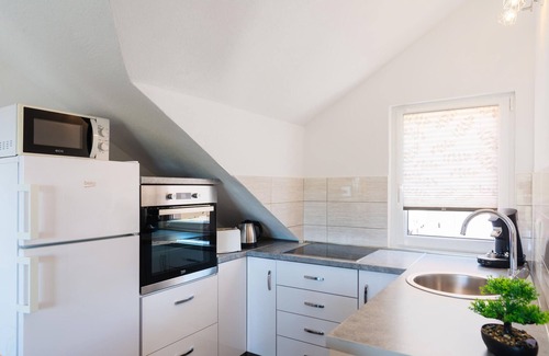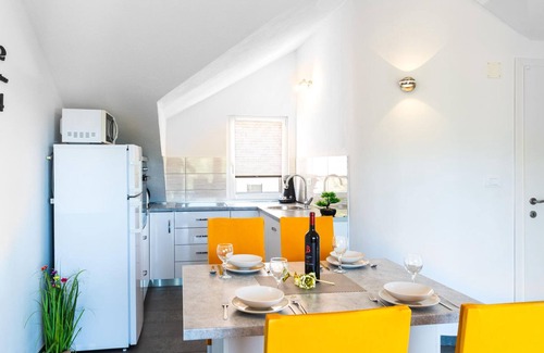 This charming holiday apartment welcomes you with a bright and inviting living atmosphere and invites you to take a sunny break right on the beach. Serve Mediterranean dishes and let the pleasant sea breeze flow through the rooms as you dine. Plan your activities here and relax in the evening with a board game or a good book.