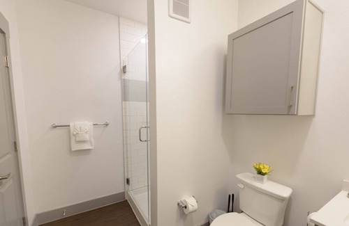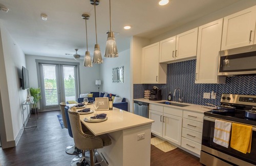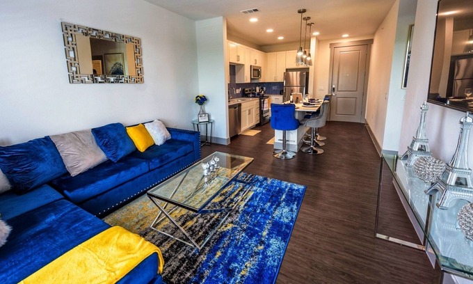 WELCOME HOME!!! This Luxury apartment comes with a fully stocked kitchen and bedroom with more than enough space to accommodate up to 4 guests. The community has a dog park, two story fitness center, resort style pool, rooftop deck with entertaining kitchen, and spacious co working space with conference rooms and offices.