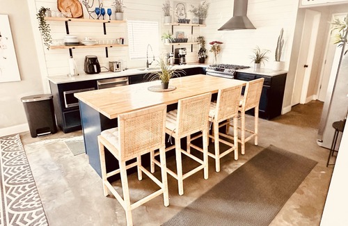 Step into an oasis of modern bohemian chic! Behold this newly crafted 3-bedroom, 2-bath bungalow by Havinn Designs, complete with a fenced backyard and a relaxing 6-person hot tub. Parking? Sorted – there's room for 3+ cars in the driveway plus street parking. With 3 queens, 4 single bunked beds, and 2 queen futons, you've got plenty of room for your crew. The spacious open concept w sleek Carrera marble countertops sets the scene. Entertainment? Covered – enjoy 3 Roku TVs w Sling TV & Netflix.