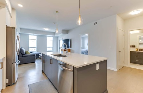 The condo is located in the heart of downtown Kelowna. You can walk to the lake or all the lovely restaurants. Modern finishings in this 2020 build. The two bedrooms and bathrooms are located on either side of the condo and separated by the living room for privacy.