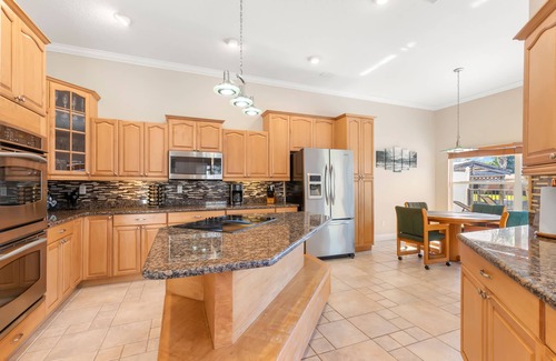 The fully equipped KITCHEN has a center island stove and companion breakfast table, custom cabinetry and tremendous lighting. A barbecue and comfortable patio furniture POOL SIDE offer more dining and entertainment choices. The kitchen is stocked with all the necessitates for making fantastic meals.