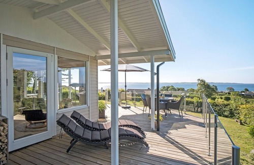 Cozy, high situated vacation home with an impressive panorama. Both from the beautiful terraces and from the living room you can follow the traffic of sail and motor boats on the Little Belt. The large living room, equipped with a wood-burning stove for the cool days and evenings, is located next to the kitchen-dining room. The cottage has a modern kitchen and bathroom.