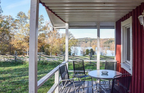 Enjoy the peace and quiet and nature in this simple but cosy holiday home. Just a few steps away from the shores of Lake Lädjasjön, it offers you the opportunity to get away from it all. Whether fishing, hiking or simply relaxing on the veranda, here you can enjoy the beauty of the Swedish countryside. The functional interior of the house consists of a living room with a sofa and a small dining area. Enjoy your meals here. The practical kitchen has the most important utensils. On cooler days, warm yourself by the fireplace, which provides additional cosiness.