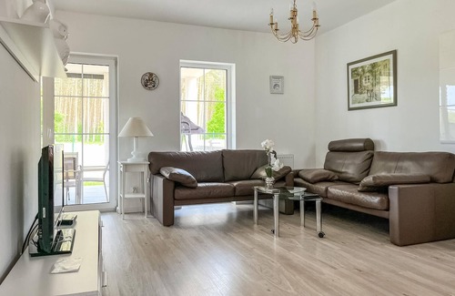 This bright and well-kept holiday home welcomes you just a few steps from the shore of the Szczecin Lagoon and offers you plenty of space for a sociable family holiday or relaxing days with good friends. Look forward to cheerful meals at the long dining table, organise harmonious games evenings or chat about times gone by in the inviting sofa corner.