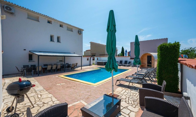 Valtursko polje is located near Pula, here you will find this comfortable and high quality furnished vacation home with pool. The terraces invite you to relax and in the afternoon take a dip in the private pool. A second property next to the main house is also at your disposal. The rich equipment and comfort of the house guarantee a pleasant stay for several families or a group of friends who want to spend their vacation together. The fenced garden is ideal for carefree playing of your children. For all guests arriving by plane, this vacation property is a great choice, because the airport is not far away.