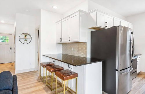 KITCHEN/DINING: Our kitchen is thoughtfully furnished with everything you need to prepare and serve meals for your whole group. The kitchen area seats 11 people including a table for 8 and bar setting for 3. We also offer a 2nd dining table on the deck. Our lodge includes basic spices and a coffee pot & Keurig combo. The kitchen also features a fridge with ice.
