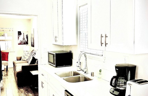 Upon entering, guests are greeted by a cozy living space featuring a plush sofa, a flat-screen TV, and large windows that allow natural light to fill the room. The kitchen is fully equipped with modern appliances, including a refrigerator, stove, microwave, and dishwasher, making it easy to prepare meals at home. A charming dining area with a table and chairs is also provided for intimate meals or entertaining guests.