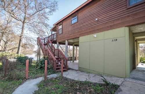 Beautiful River Front Log Cabin Treehouse with the Colorado River running through the back yard. This newly remodeled 2 bedroom 1300 sq ft cabin has a wrap around upper deck for spectacular views of the river, gas grill; spacious living room with vaulted ceiling; Mayan family indoor/outdoor hammock; Sleeps 6, king and queen bedrooms and very comfortable pull out sofa bed; fully equipped kitchen with all amenities; large bathroom with huge walk-in stone and glass tiled shower; washer/dryer; ping pong table, picnic table and porch swing on downstairs patio; private dock great for fishing and kayaking. Only 2 miles from historic downtown Bastrop; 25 miles from the airport (AUS) and 40 minute drive from Austin. Golfing, kayaking, bicycling, shopping, fishing, live theater, antique shops, farmer's markets.