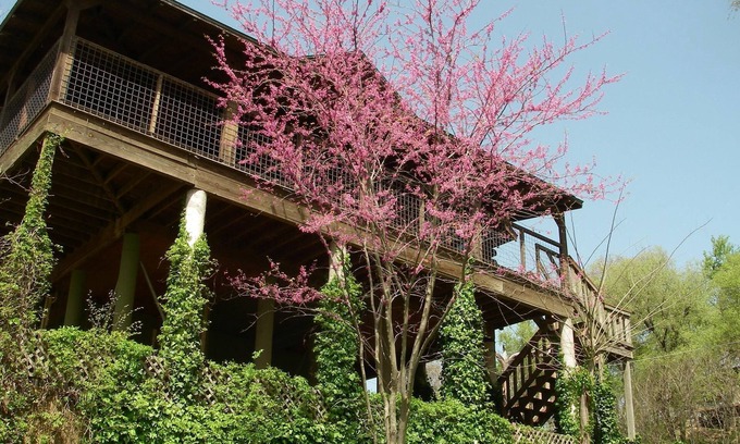 Beautiful Log Treehouse: We bought this cabin in the summer of 2009 and feel so fortunate to be able to share it with guests and friends and family. All three of our kids (now grown) love coming here to kayak, fish, golf, bird watch, relax and explore with their families. Our cabin is nestled high up in Pecan, Sycamore, Mimosa and Redbud trees. The view from the upper deck is fantastic. Great for bird watching. We hear the owls at night and watch red tailed hawks make nests and raise their babies. We have left the chicken coop standing as some day we hope to retire here and raise a small flock. You can't beat this for a perfect vacation spot whether you're wanting adventure or relaxation.