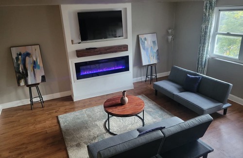 Welcome to this beautifully renovated private home oasis! Located just a short 10-minute walk from the Metro North Train Station, this home offers a convenient 28-minute commute to Grand Central Station in NYC. Inside, you’ll find a completely renovated space with a modern bathroom, stainless steel kitchen appliances, spacious bedrooms, a garage, electric fireplace, high-speed Wi-Fi, and a smart TV with streaming services. Enjoy the comfort of central air conditioning and unwind in the private backyard during your stay!