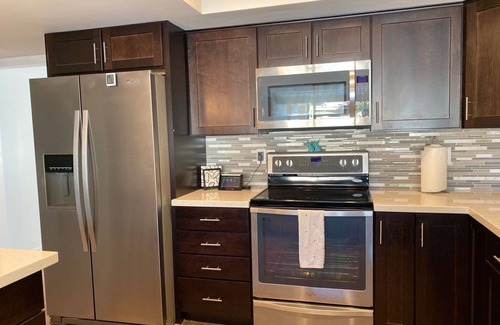 Main bedroom has a brand new Tuft and Needle king sized mattress, two closets, large dresser and an ensuite bathroom. The bedroom has a den area that has been converted into a home office for those that want to work from their home away from home. Patio doors open to the backyard and is steps from the hot tub.