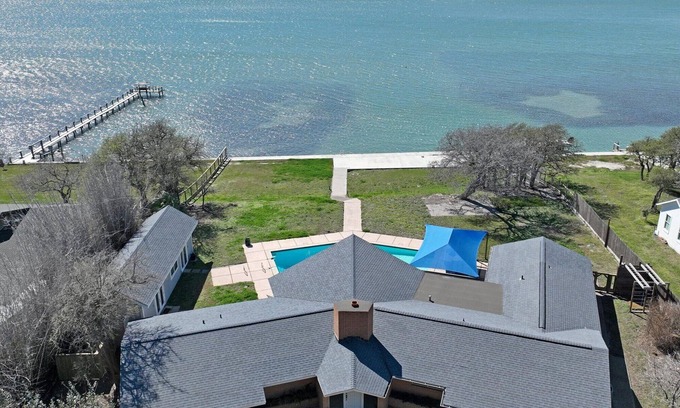 The moment you walk in the front door the view is captivating! The glass windows and doors along the back of the house open to the most amazing pool and water views as far as you can see. The open living room and kitchen are a great place to bring your whole group together. Out the back door you will find an outdoor kitchen, 12-foot-deep pool, huge yard with over 150 feet of bulkhead right on the water. Take a dip in the pool, fish off the dock, grill some Texas BBQ or just sit and enjoy the views. Amazing Pool! Waterfront, Outdoor Kitchen, Room for the whole family! You don’t want to miss the amazing sunsets!