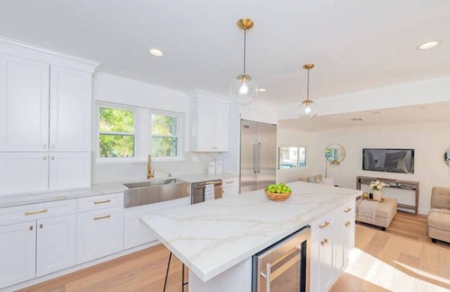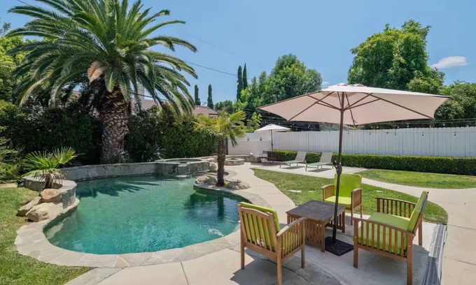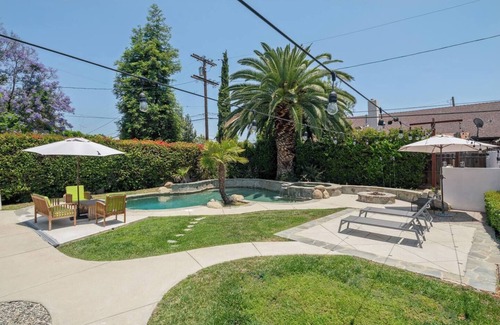 Relax in this oasis during your stay in Los Angeles for a quick trip or a longer stay. Spend the day lazing around the tropical pool, then cook like a chef in the beautiful kitchen, dine al fresco and slide into the hot tub. This fully furnished, fully stocked property is like moving into a home. The front yard has a play structure, while the very private back yard boasts a sparkling pool and spa with multiple seating areas.