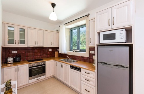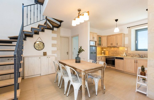 Entering the first independent area on the ground floor there is a spacious open plan area, consisted of the living room, indoor dinning area and a fully equipped kitchen with top quality fixtures. ?he living room features a 45 smart TV with Netflix, Bluetooth speaker and direct access to the veranda, equipped with an outdoor dining table, offering beautiful sea views and overlooking the pool. There is also a double bedroom, also having wonderful views, and a bathroom with a bathtub. Reaching the first floor, guests can find one additional bedroom featuring two single beds and offering sea vistas. A second bathroom equipped with a shower cabin is also available. This bedroom is also featuring an attic, with an extra single bed.