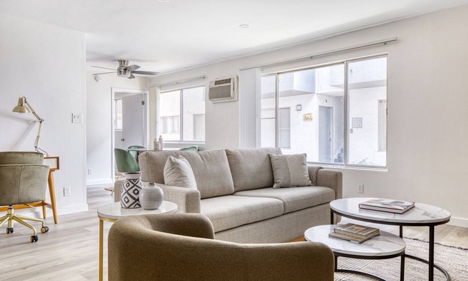 This furnished home is located in Valley Village, a sought-after neighborhood in Los Angeles's San Fernando Valley. Bordering North Hollywood, the area is home to walkable shopping, dining, and entertainment. It's easy to buy groceries and cook for yourself or head to neighborhood spots like Marie et Cie or Rustic Spoon for a delicious meal. Another neighborhood gem is Valley Village Park, a pocket-sized green space with a playground, a picnic area, and sports fields. Although Valley Village is walkable, most residents rely on cars to get around.